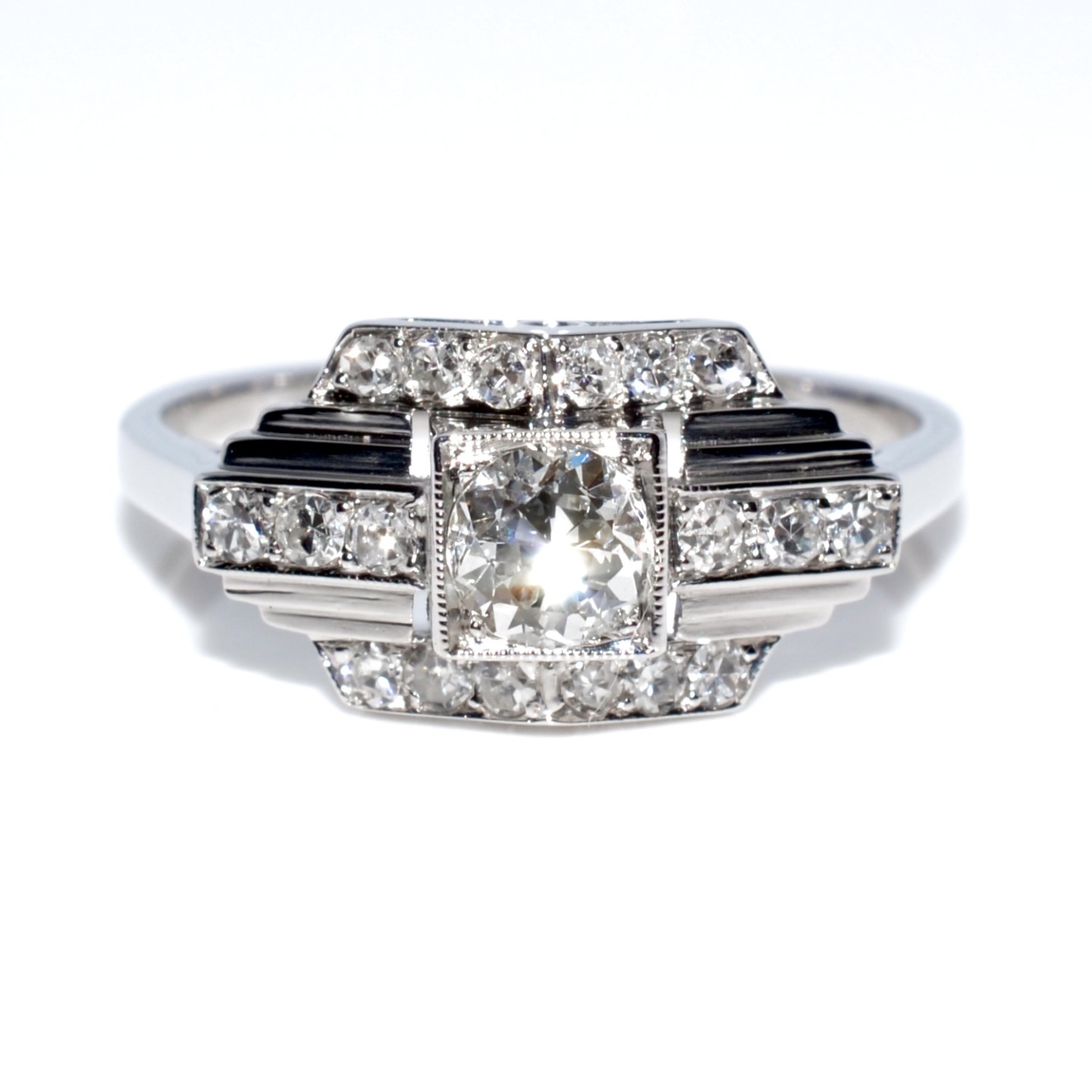 The design of this ring with its geometric lines is typical of the Art-Deco period, circa 1920-1930.