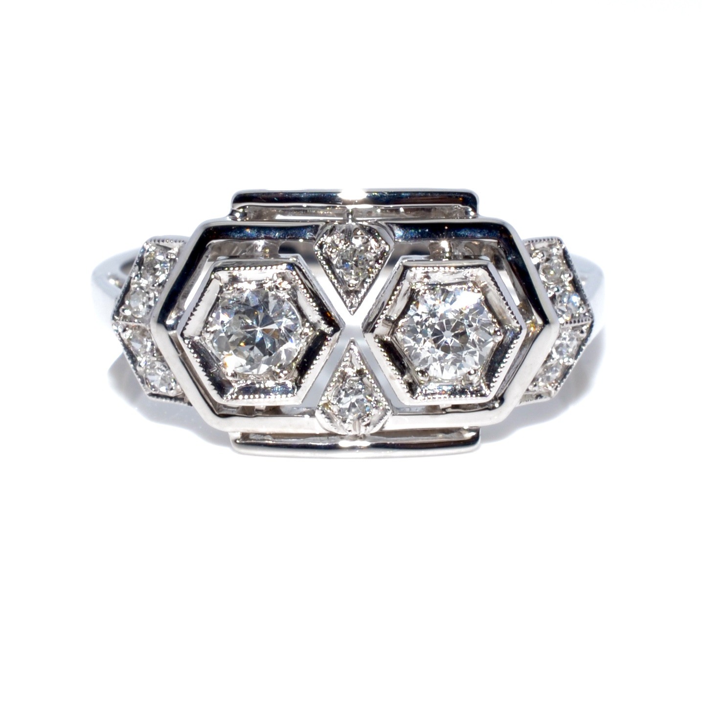 The design of this ring with its geometric lines is typical of the Art-Deco period, circa 1920-1930.