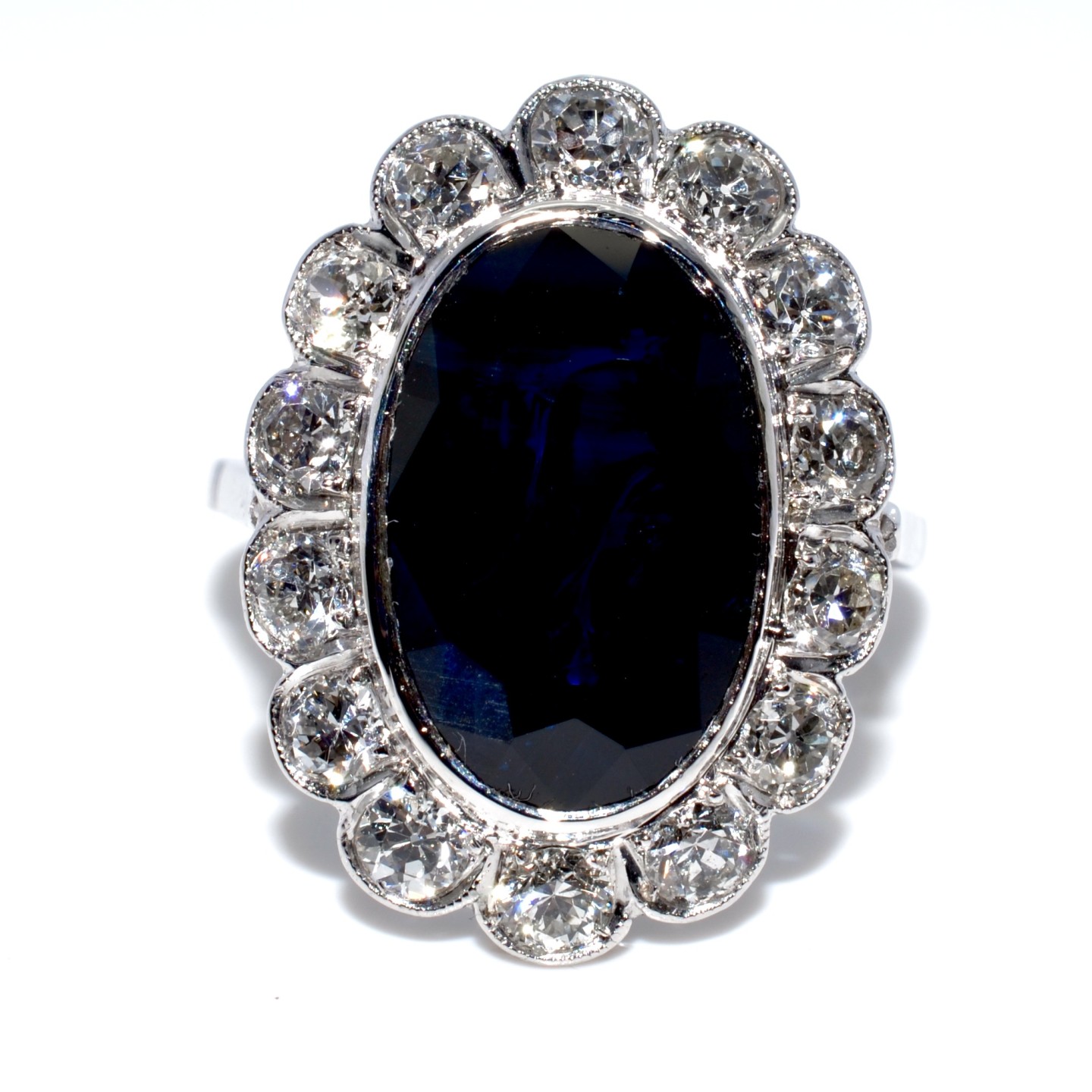 Art Deco rings in platinum set with an Australian sapphire perfectly illustrate the geometric aesthetics and refinement of the 1920s-1930s. In the center, the Australian sapphire stands out for its deep blue, almost nocturnal color, which contrasts harmoniously with the brilliance of the old-cut diamonds surrounding it. These rings embody meticulous craftsmanship and understated elegance, combining modern design with rich materials. Sought-after for their uniqueness, they appeal to aficionados of antique jewelry and lovers of characterful stones.