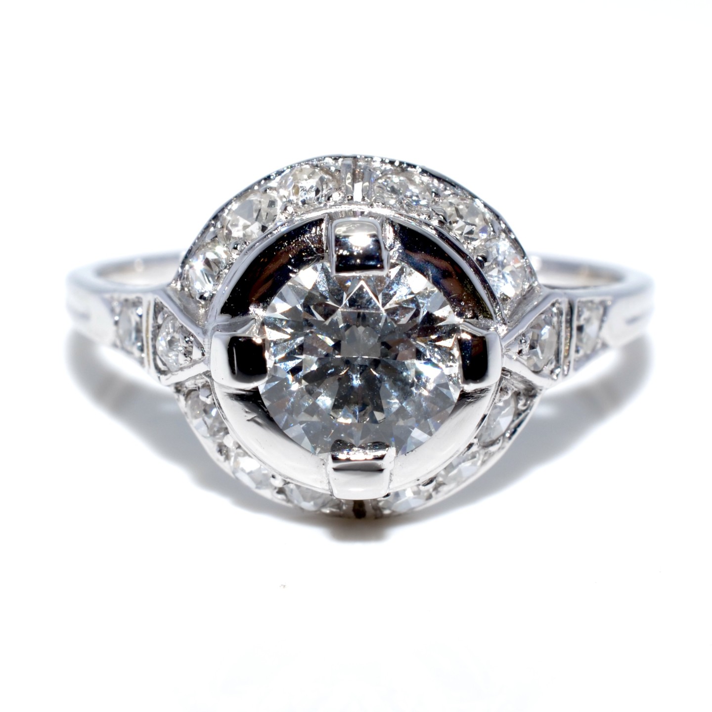 Round Art Deco rings in platinum and diamonds, created in France in the 1920s, are representative of the refinement and jewelry precision of the period. Their circular structure features a pavement of old-cut or brilliant-cut diamonds, arranged in geometric, rosette or halo motifs around a central stone.