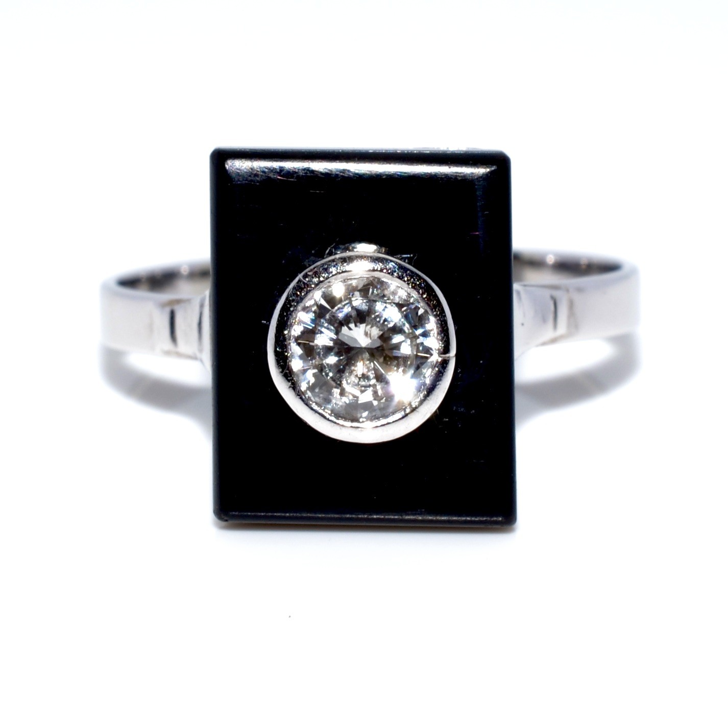 18K Gold (750/1000) Ring set with an Onyx and a Brilliant Cut Diamond, circa 1960.