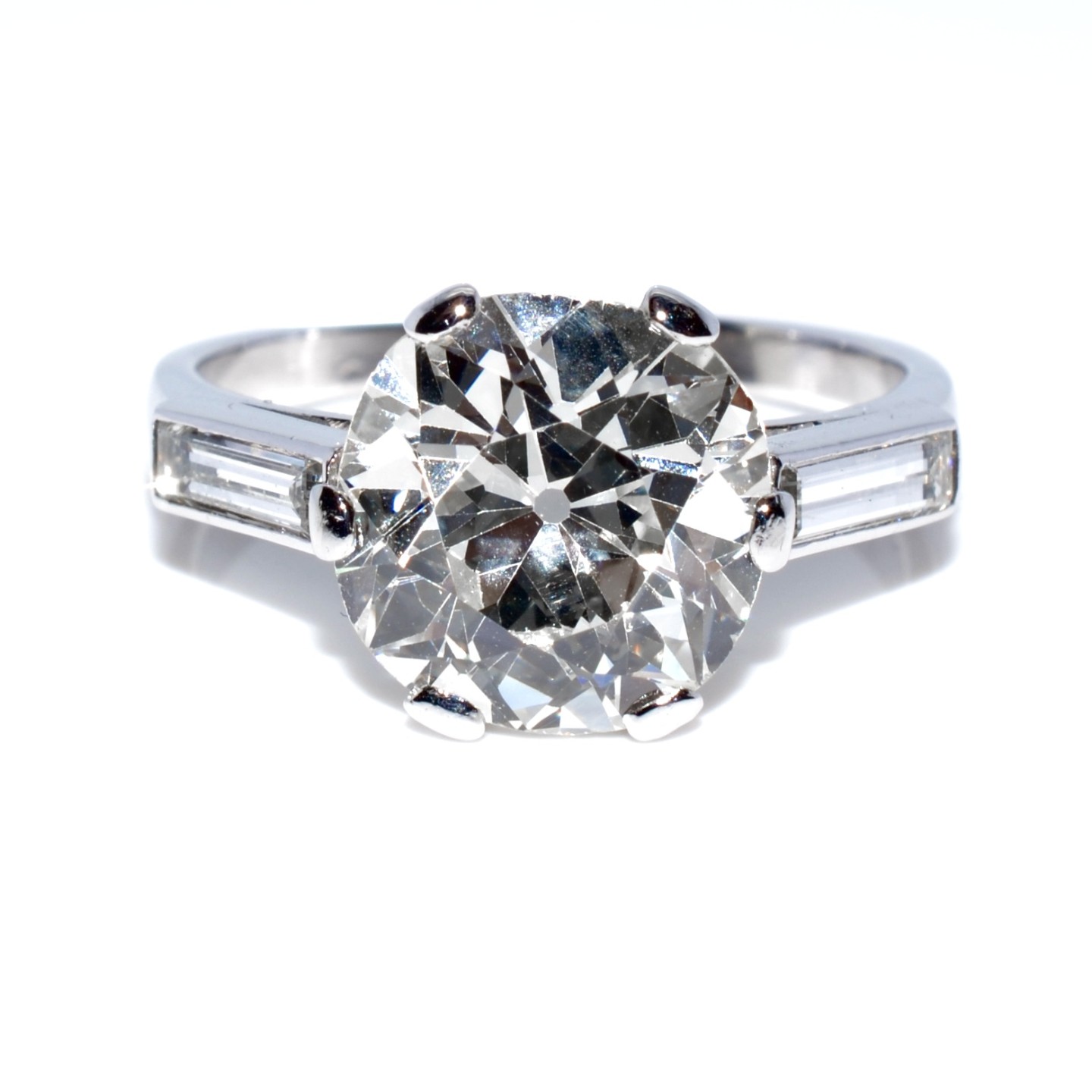Hide pricesThis ring in 18k gold and platinum is set in its center with an old-cut diamond weighing 3,52 carats. It is flanked by two long baguette-cut diamonds positioned at the top of the ring.