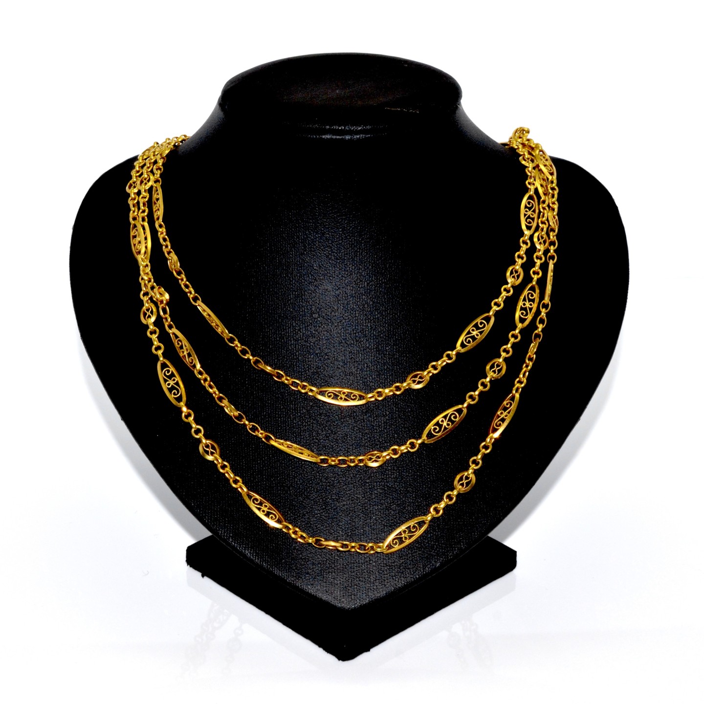 Hide pricesThis long, antique necklace in 18-carat yellow gold features a filigree mesh pattern alternating with links and a spring-ring closure.