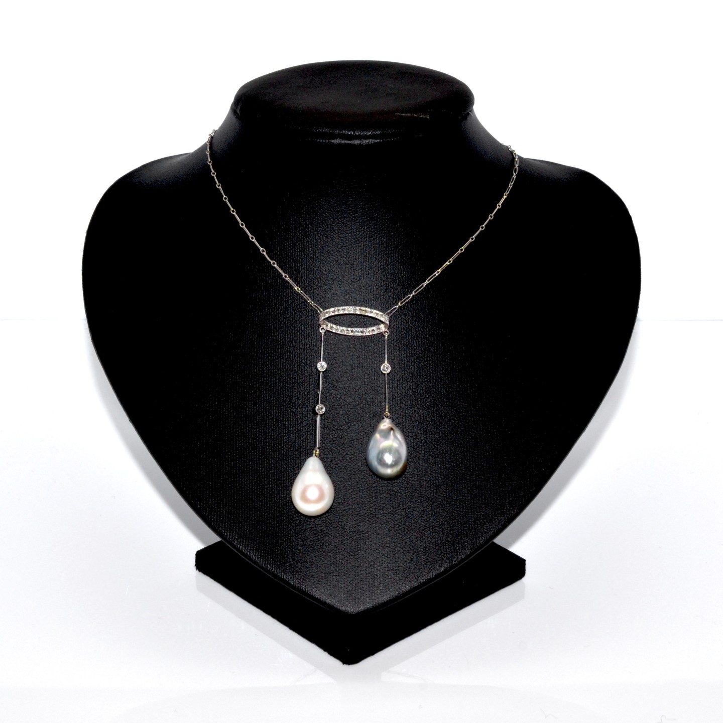 Hide pricesThis beautiful antique pendant is set with two large cultured pearls, one white and one gray. The delicate setting is embellished with small old-cut diamonds. Entirely crafted in platinum (including the antique chain), circa 1920 (Art Deco period).