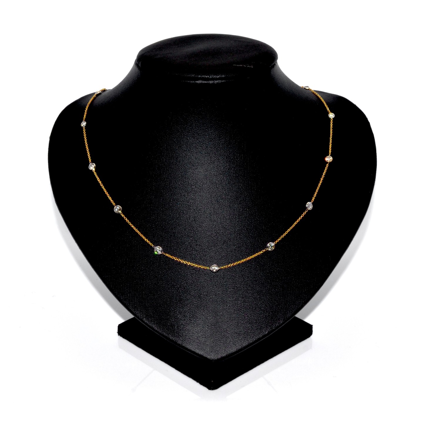 Hide pricesThis beautiful 18-carat yellow gold necklace (750/1000) is set with 15 brilliant-cut diamonds, for a total weight of 2.17 carats. The diamonds are set in a white gold collet, and the chain is crafted in yellow gold with a curb link.