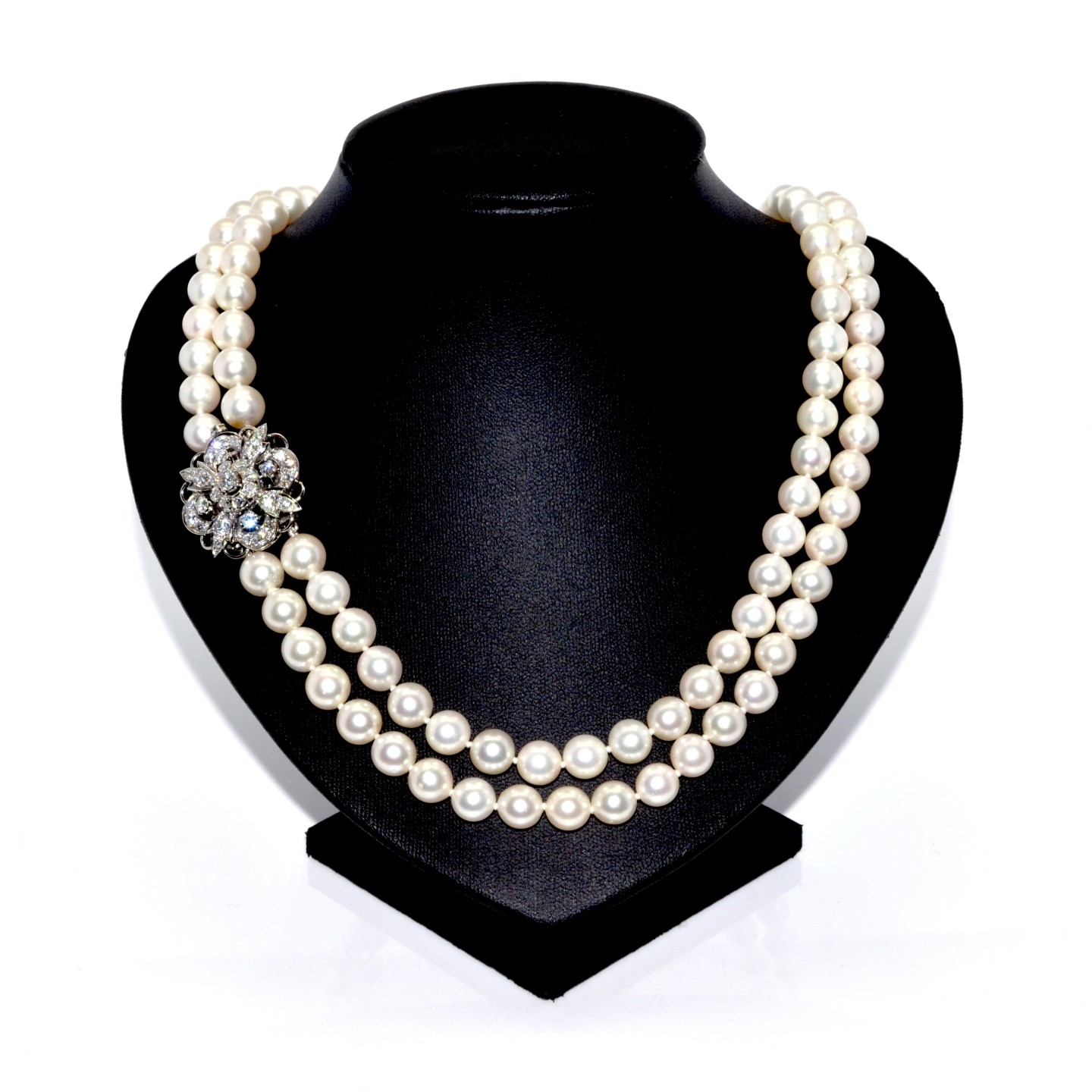 Hide pricesThis beautiful 60cm vintage necklace features a double strand of cultured pearls (ranging from 8mm to 8.8mm) in a beautiful cream color. The 18K white gold clasp is set with brilliant-cut diamonds.