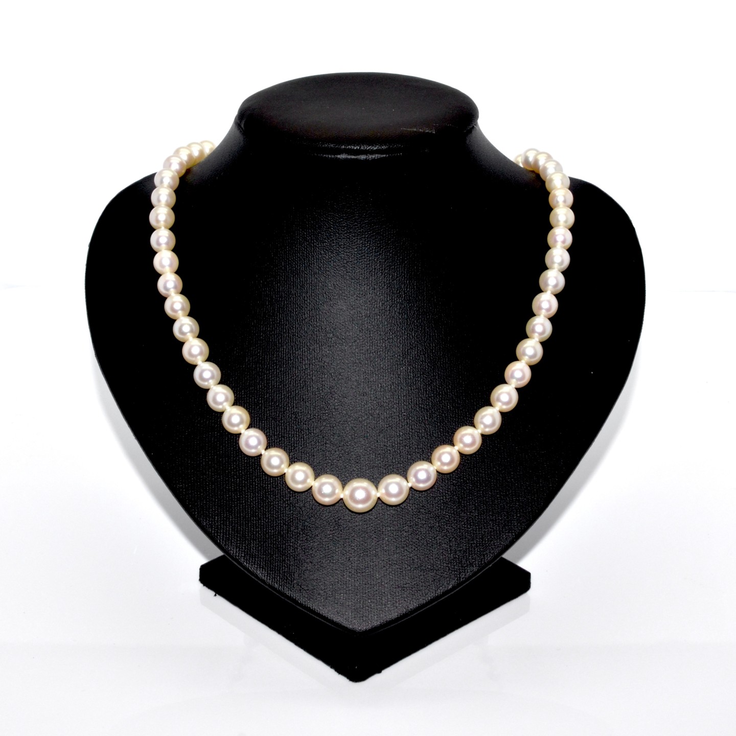 Hide pricesThis beautiful vintage necklace of 42cm is composed of a row of 61 calibrated cultured pearls (6,7 to 9,4mm approximately). They are of a beautiful cream color. The 18k white gold clasp is in perfect condition. It is set with brilliant cut diamonds for a total weight of about 0,6 carat. The necklace is perfectly positioned and is very elegant.