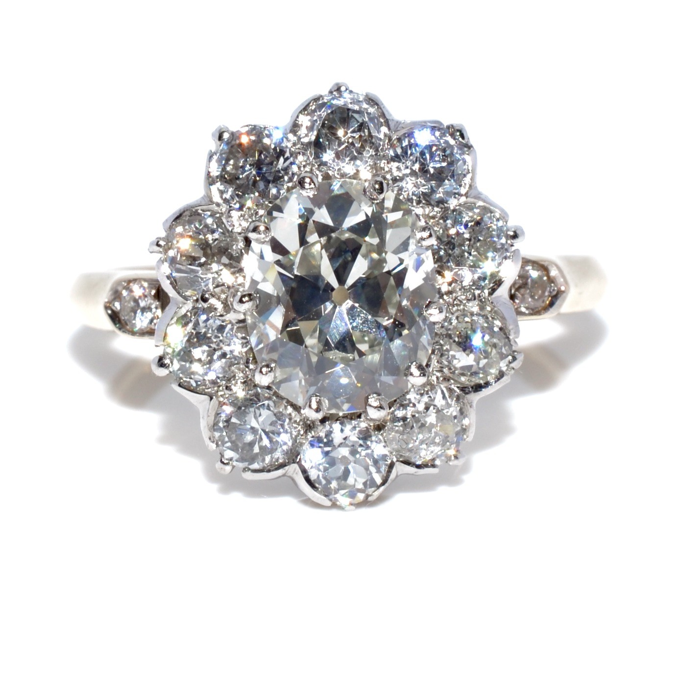 Hide pricesThis beautiful Pompadour ring in 18-carat gold and platinum is set at its center with an oval old-cut diamond weighing 1.48 carats. It is surrounded by old-cut diamonds with a total weight of 1.10 carats.