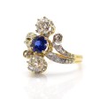 Hide pricesThis beautiful antique trilogy ring in 18K gold and platinum is set with two old-cut diamonds weighing together approx. one carat and a deep-blue sapphire weighing approx. 0.70 carat. The band is set with rose-cut diamonds. The ring is beautifully crafted.