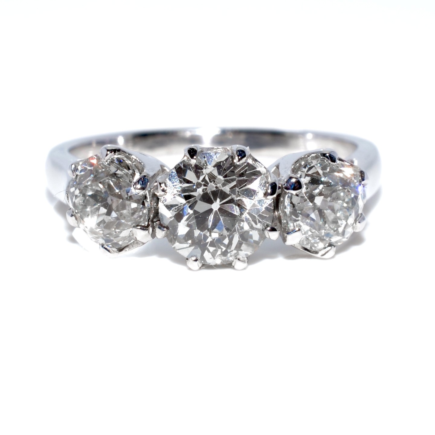 Hide pricesThis superb 18K white gold ring is set at its center with a diamond weighing 1,01 carats, flanked by two others weighing 1,31 carats. This makes a total of 2,32 carats. All three are old cuts from jewelry dating from the 1920s-1930s. A classic !